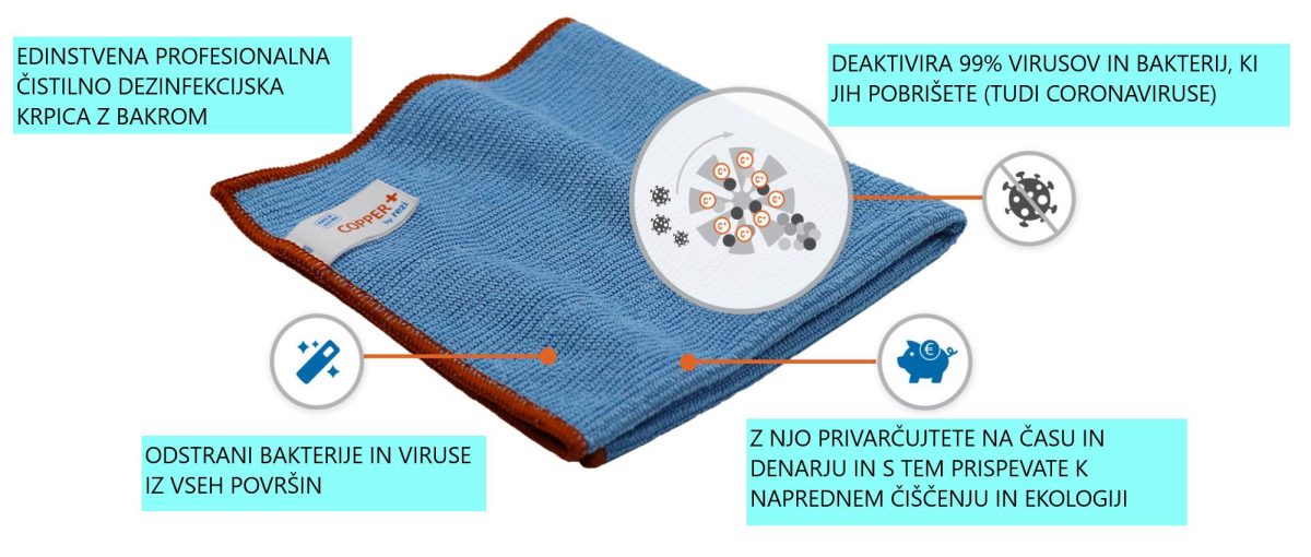 Copper Plus čudežna krpica za čiščenje odstranjuje viruse in bakterije samo z navadno vodo. Razvita je bila v sodelovanju z Univerzo v Innsbrucku in je izdelana iz ultra finih mikrovlaken, ki so obdelana z drobnimi bakrenimi pigmenti. Ne praska in ne pušča sledi. Znanstveni laboratorijski testi dokazujejo, da v 99,9 % odstranjuje vso umazanijo, bakterije in viruse z prav vseh površin in to preprosto samo z vodo. Absorbirane bakterije in virusi se ujamejo v krpo in se deaktivirajo v izjemno kratkem času.